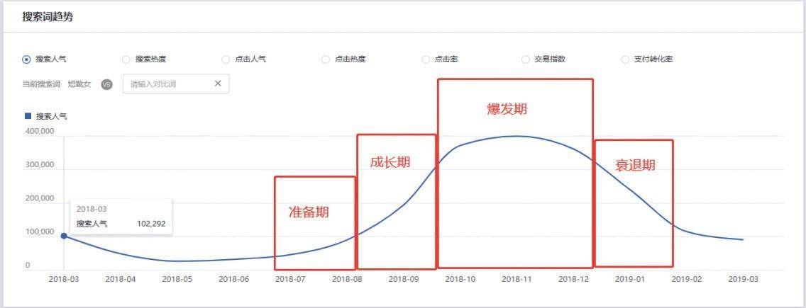 成长期不仅行业的搜索人数在上升,一般转化率也会持续上升,因为这个时候旺季已经激活了,买家的购物热情也已经高涨了,所以购买的积极性也会大大提高。一旦进入成长期,就是抢夺流量的高峰期,我们在这个时候要抓紧加快布局引流。